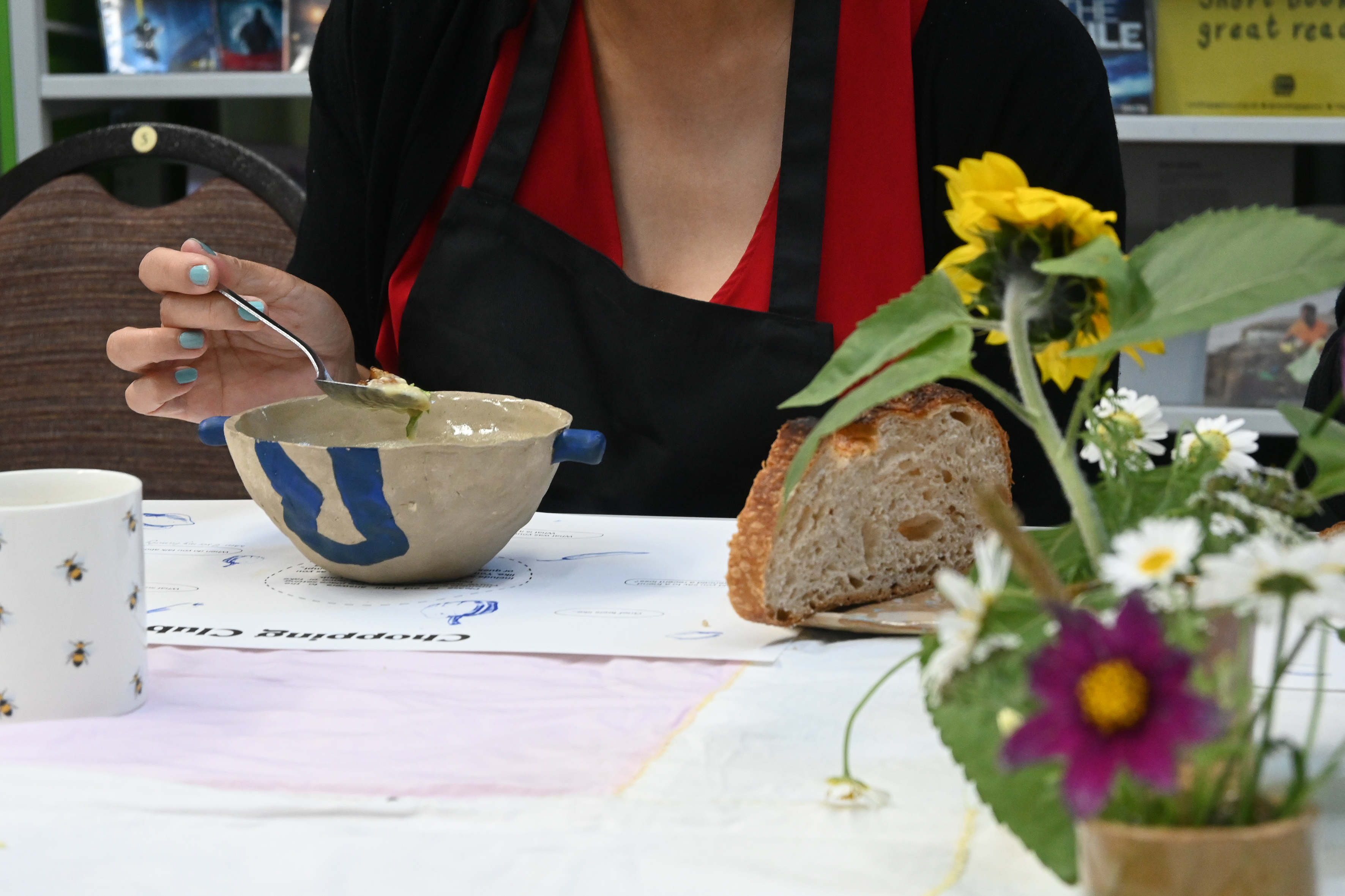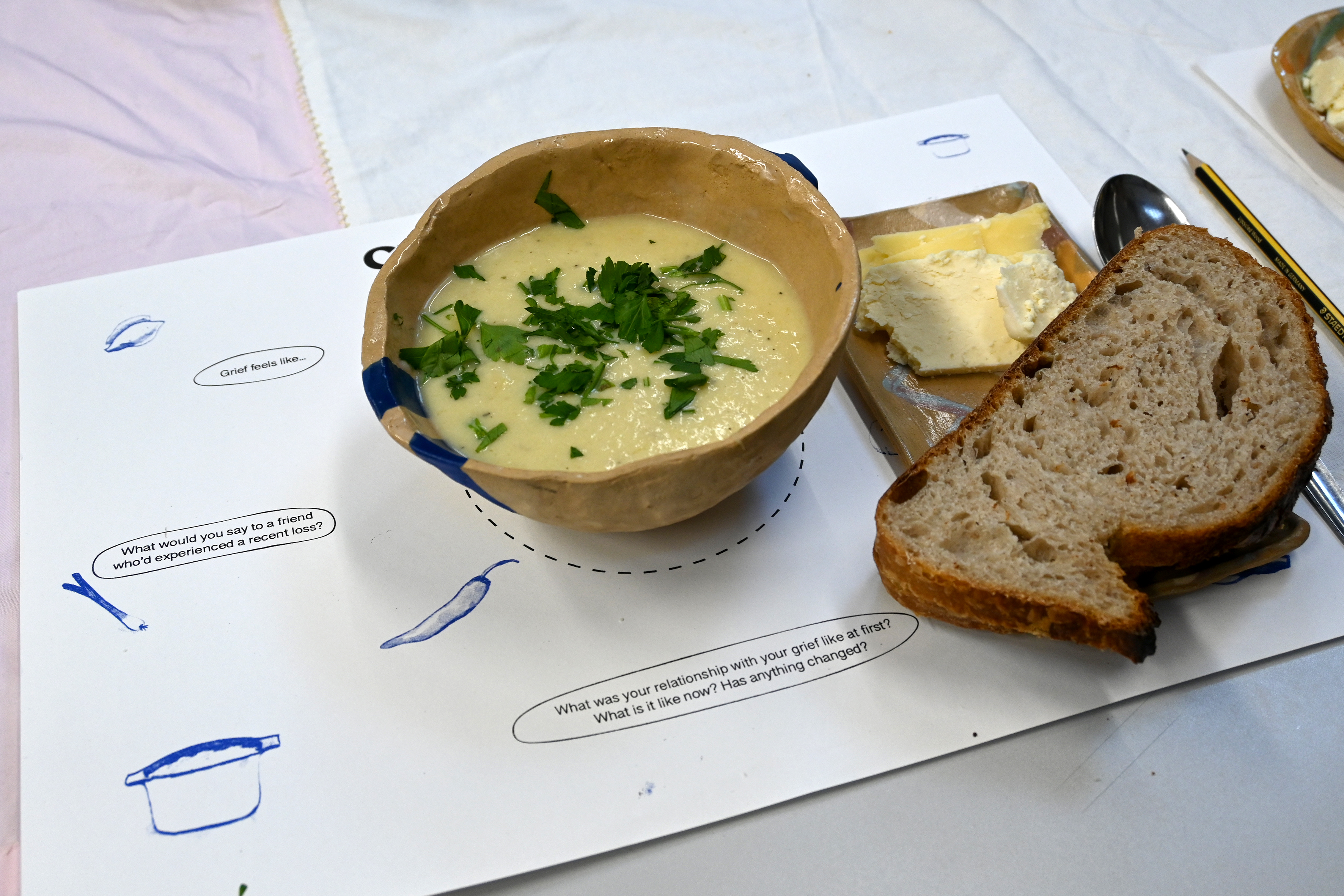 Before we sat down to share food, we spoke about the different tastes that remind us of the person who died; real ale, rice pudding with the skin on, cheesy potato skins (as well as laughing at some of their terrible cooking skills). We spoke about how preparing and eating these foods can create space to think about the person we miss, and how it doesn’t always feel like there are enough spaces to talk about them. We noticed that giving attention to our grief could be nurturing, and how cooking could bring them into the space for a moment.