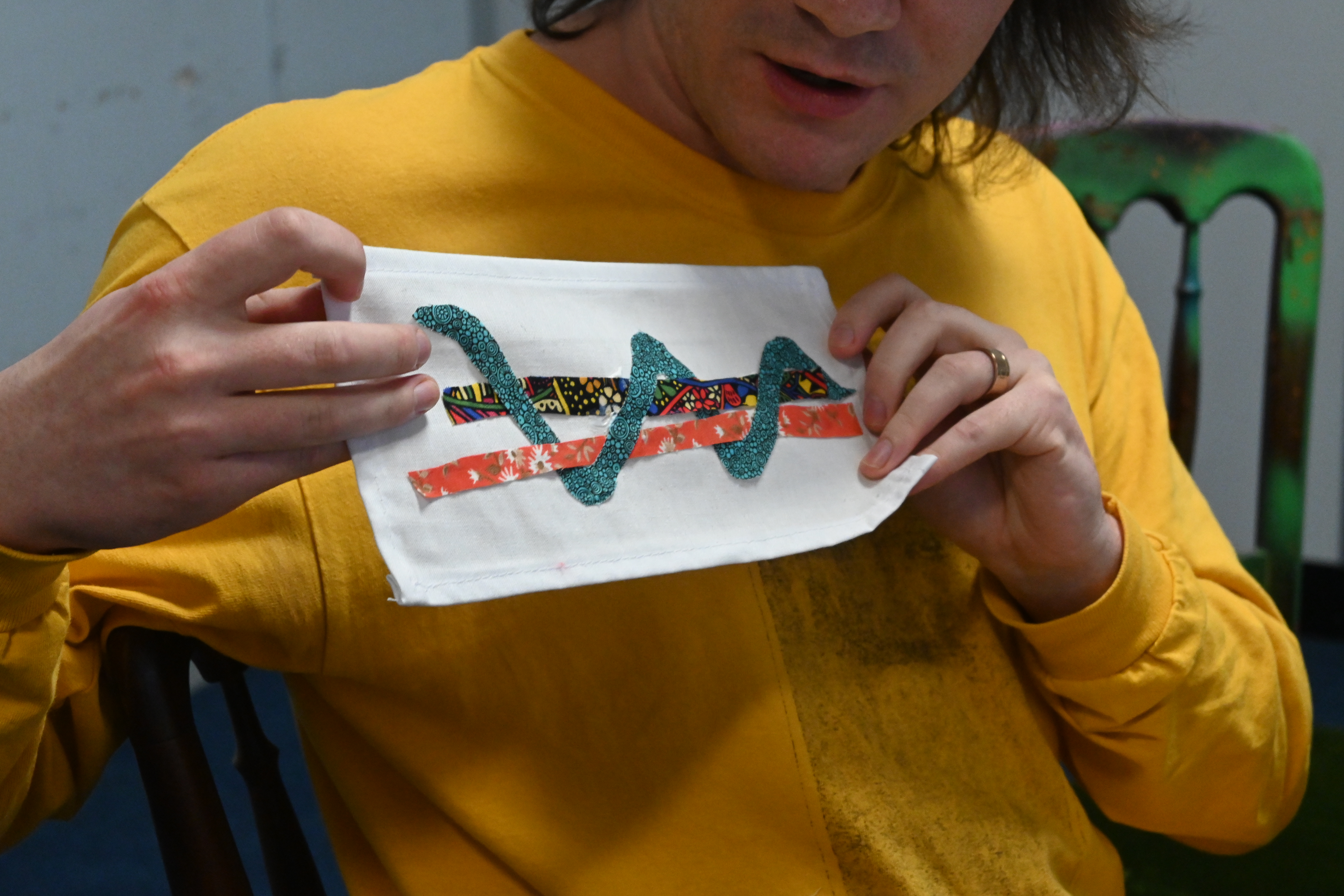 In the workshop, we guide people through basic design, sewing and embroidery techniques. The communal activity acts as a ‘softener’ for difficult conversations, creating a space that words are invited to fill.