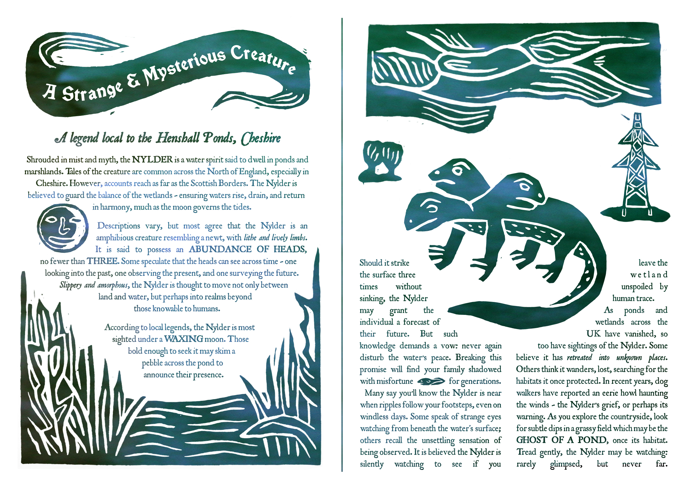 The final artwork is a print inspired by medieval woodcuts once used to alert people to supernatural happenings. It depicts The Nylder; a strange, three-headed newt believed to protect the Henshall Ponds, ensuring the water drains and returns in harmony. The creature is said to hold unnatural powers - one head watching the past, one the present, one the future, or perhaps seeing things we can’t yet conceive of. The folklore also tells of The Nylder’s disappearing habitat, and what that loss might mean for all of us.