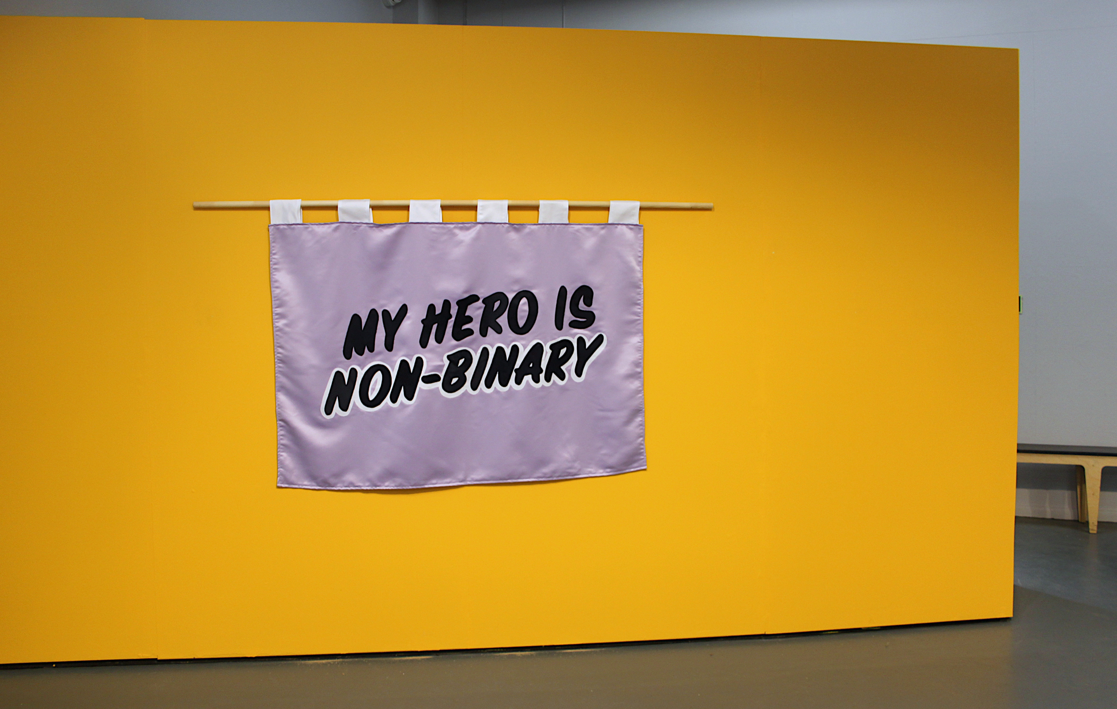 Textile banner with with text reading ‘my hero is non-binary’. The banner is a celebration of mine and my communities identity - which is often left uncelebrated as it’s amporphous and defintion defying nature perterbs people. The banner makes a bold but vague statment, much in the spirit of it’s community.